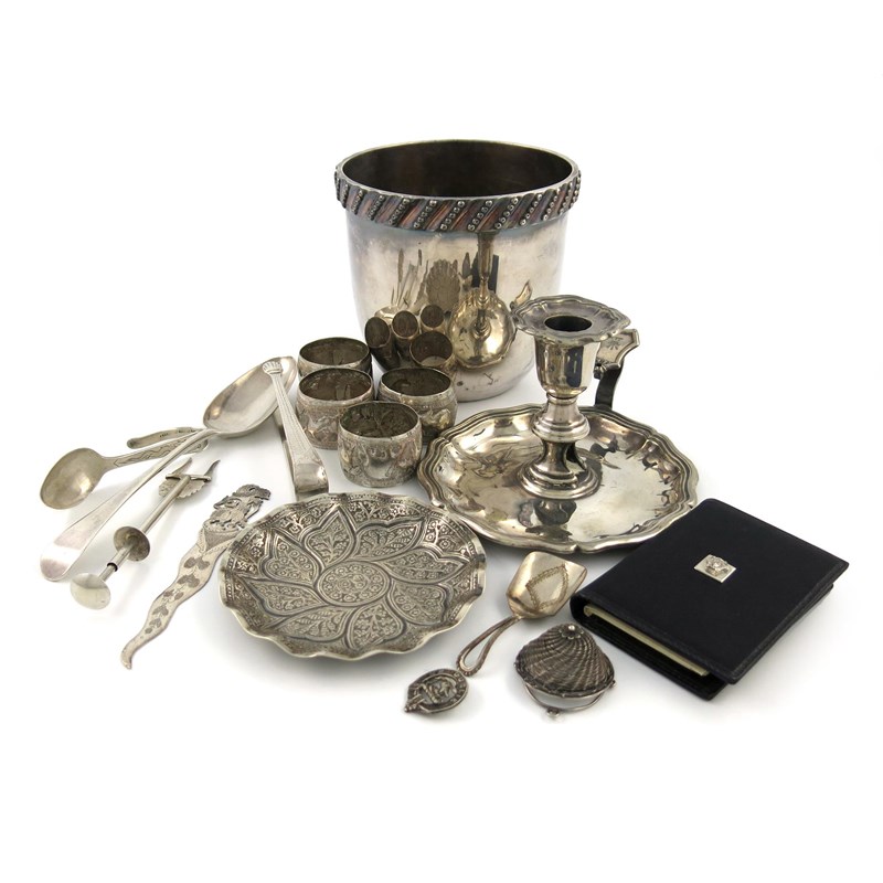 comprising silver items: a tablespoon, a pair of sugar tongs, a baby feeding spoon, an olive fork, an Indian dish, four napkin rings, a tea strainer, and a paper knife, plus electroplated items: a French ice bucket by Hermes, a chamber stick, a caddy spoon, a clan badge and a note book, approx. weighable 8.4oz. (qty)