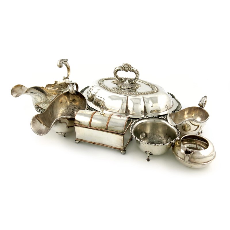 comprising: a George II silver sauce boat, London possibly 1749, oval form, later decoration, one foot a.f, plus electroplated items: an entrée dish and cover, a cream jug, an inkwell, and two sauce boats, one a.f, approx. weighable 12oz. (qty)