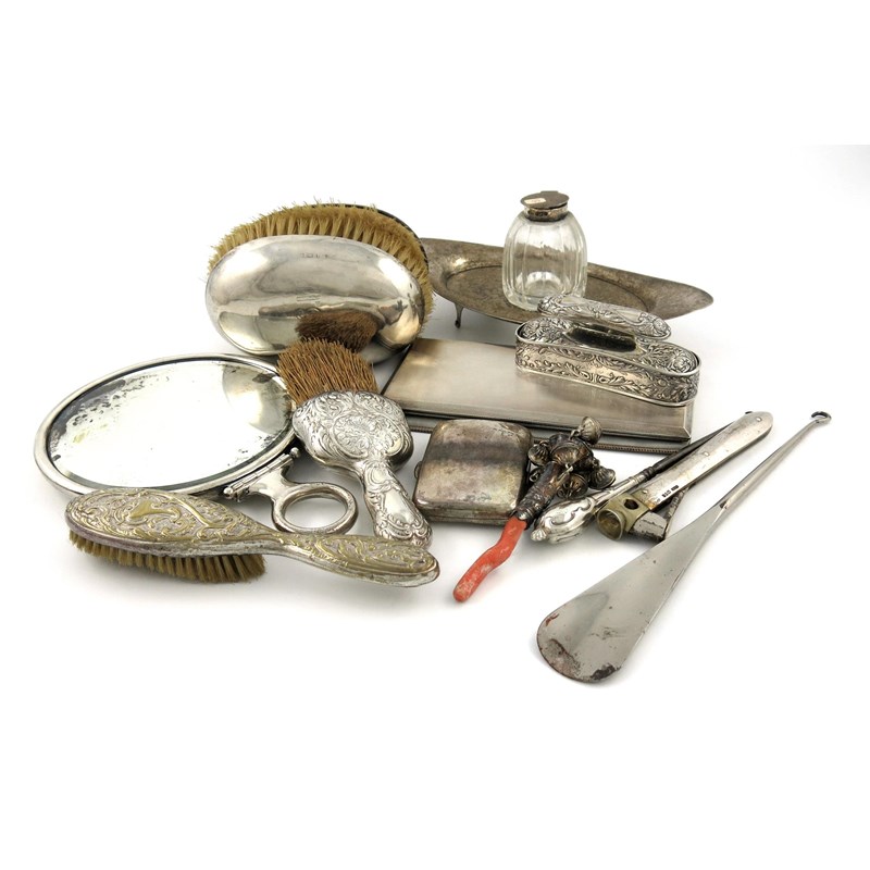 comprising: an inkwell of oval navette form, Birmingham 1905, a large cigarette case, a pair of military brushes, a mirror, another cigarette case, a cigar cutter, a nail buffer, a baby's rattle, two brushes, a shoe horn and a button hook, approx. weighable 17oz. (qty)