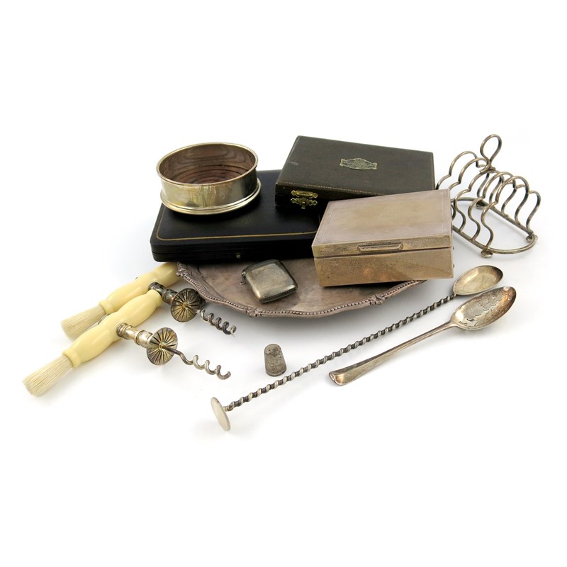 comprising: an Edwardian salver, London 1902, circular form, beaded border, one foot a.f, a vesta case with a hinged side compartment for stamps, a cigarette box, a toast rack, a thimble, a spoon with a pierced bowl, a cased set of six New Zealand silver and nephrite teaspoons, by J. Swindell and Son, a cased set of six teaspoons, plus an electroplated coaster and spoon and two modern plastic handled corkscrews, approx. weighable 20oz. (qty)