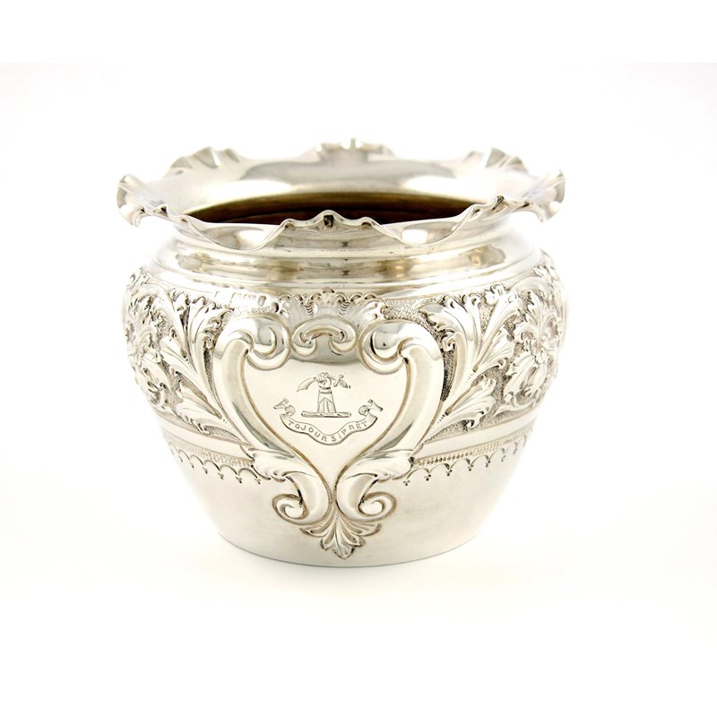 circular form, embossed foliate scroll decoration on a matted background, wavy-edge crimped border, engraved with a crest, height 9.8cm, approx. weight 14oz.