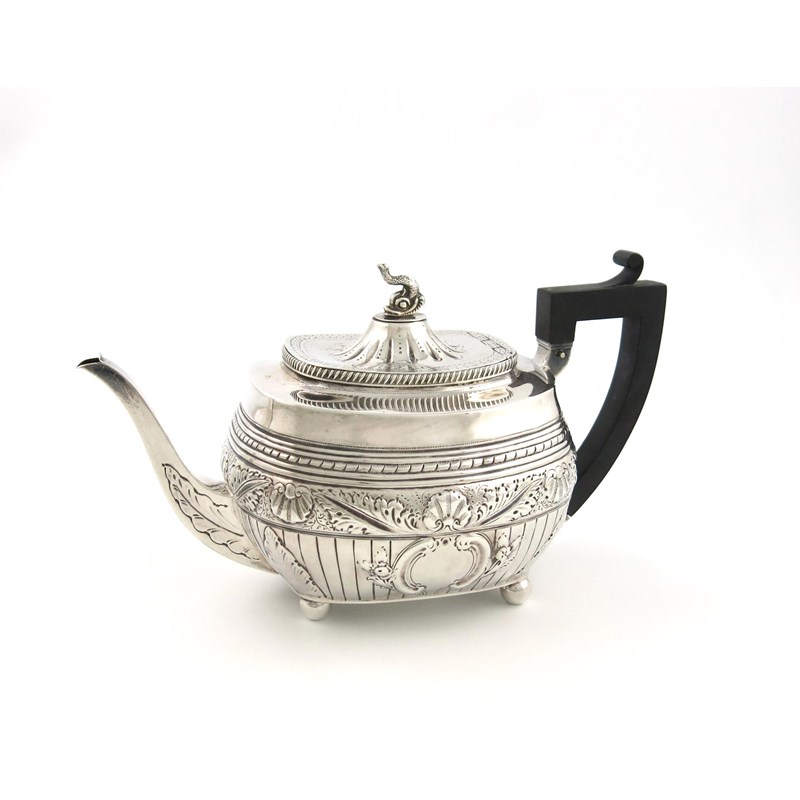 oblong bellied form, embossed foliate decoration, scroll handle, on four ball feet, approx. weight 16.5oz.