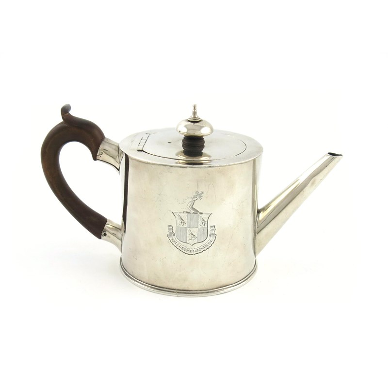 plain drum form, scroll handle, later finial, tapering spout, engraved with an armorial, length handle to spout 23cm, approx. weight 15.5oz.