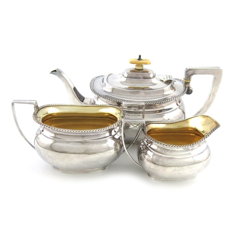 oblong bellied form, gadroon border, ivory finial and insulators, length handle to spout 28.3cm, approx. weight 34oz. (3)