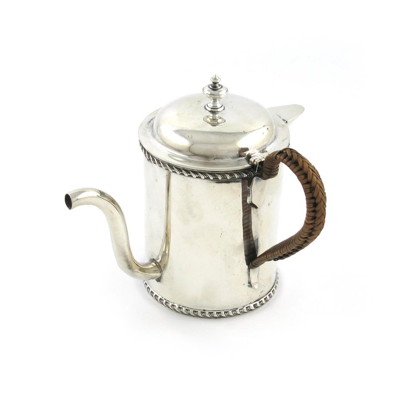 circular form, gadroon borders, wicker-bound scroll handle, domed hinged cover with a knop finial, height 13cm, approx. weight 14oz.