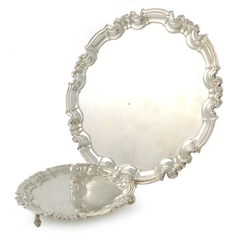 circular form, moulded border, on three gnarl feet, plus an Edwardian silver waiter, by the same maker, London 1908, circular form, moulded border, on three gnarl feet, approx. total weight 27.5oz. (2)