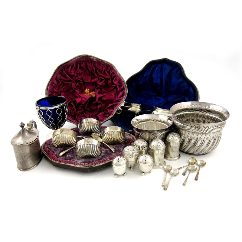 comprising: swing-handled sugar basket, London 1897, with a blue glass liner, a cased set of four salt cellars and spoons, a cased pair of salt cellars, one liner lacking, plus a mustard pot, two bowls, three pairs of pepper pots, a single pepper pot, and various condiment spoons, approx. weighable 26oz. (qty)