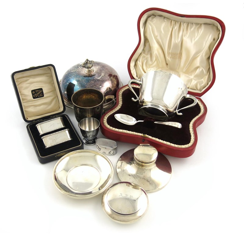 comprising: a silver-gilt mug, London 1894, a cased christening bowl and spoon, London 1900 and 1901, a tobacco box, a dish, a capstan inkwell, a cased pair of napkin rings, plus an electroplated muffin dish and cover and an egg cup and napkin ring, approx. weighable 21.5oz. (qty)