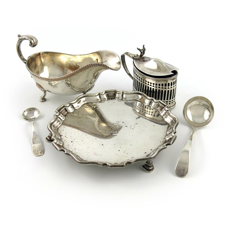 comprising: an Edwardian waiter, London 1903, moulded border, the centre with a crest, plus a mustard pot, a sauce ladle, a mustard spoon and an electroplated sauce boat, approx. weighable 9.5oz. (5)