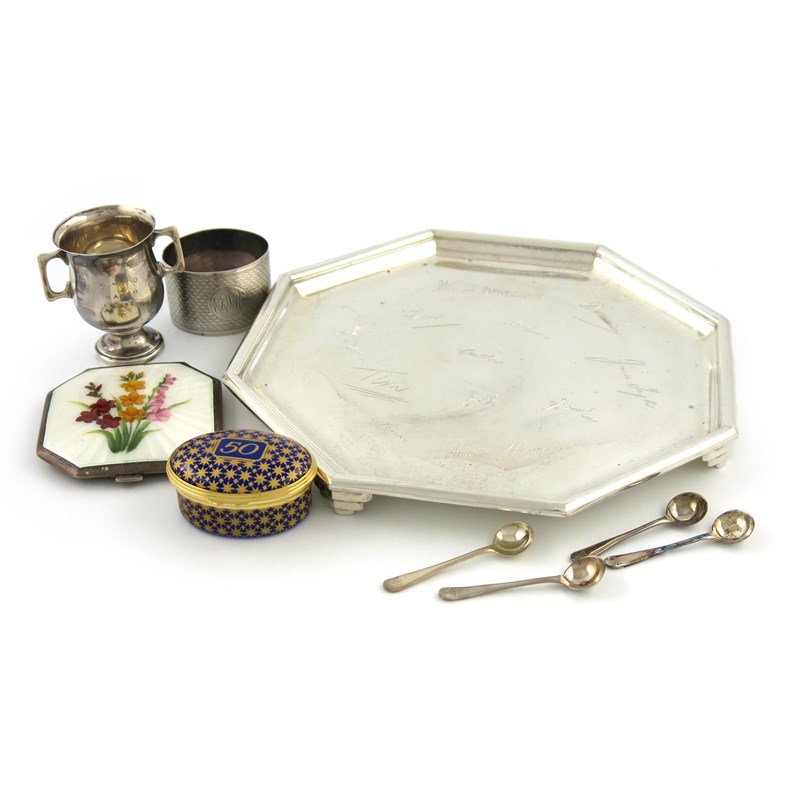 comprising silver items: a presentation waiter of octagonal form, inscribed, Birmingham 1939, plus a silver and enamel compact, four salt spoons, a napkin ring and a miniature trophy cup, plus a modern Halcyon Days box, approx. weighable 17oz. (7)