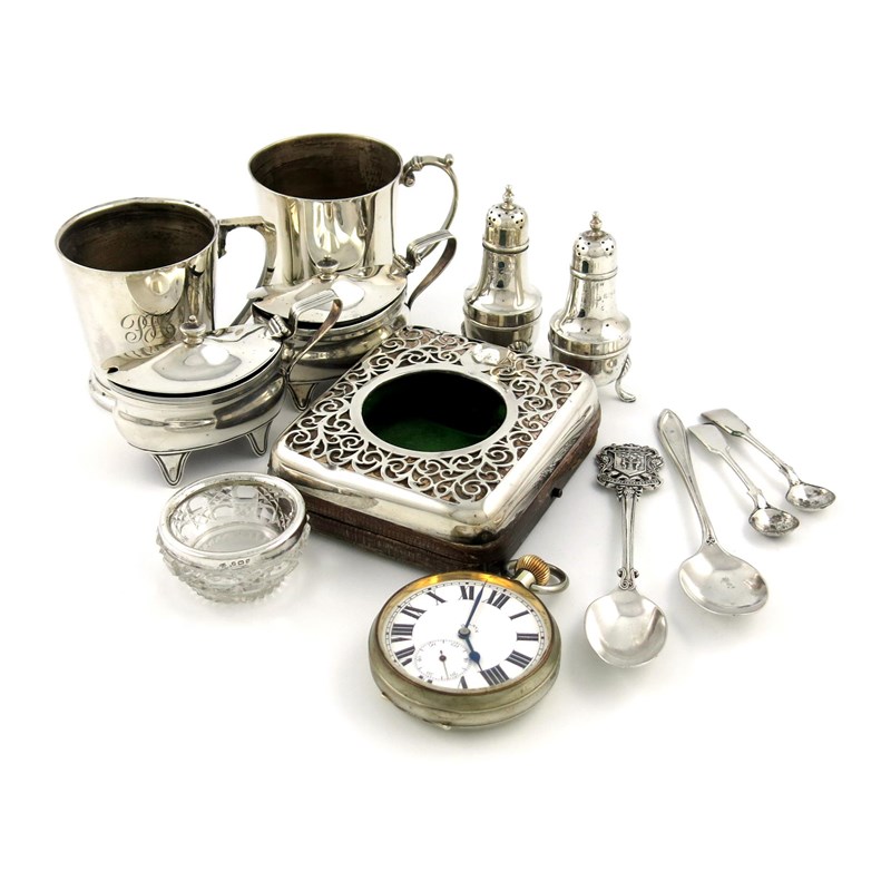 comprising: two christening mugs, a pair of mustard pots, London 1913, a pair of pepper pots, a salt cellar, two spoons, and a silver-mounted clock, London 1914, with pierced decoration, approx. weighable 17oz. (qty)