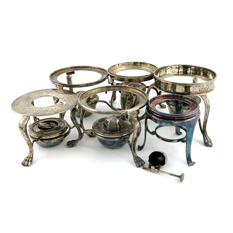 comprising: a George III one by John Emes, London 1801 with a burner, one by Richard Cooke, London 1804, a pair London 1925, and single one, and an electroplated one by Christfole, approx. weighable 63oz. (6)