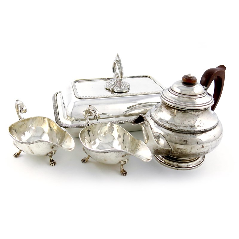 comprising silver items: a tea pot, of circular form, by the Adie Brothers, Birmingham 1932, plus a pair of oval sauce boats, Birmingham 1899, and an electroplated entrée dish and cover, approx. weighable 23.5oz. (4)
