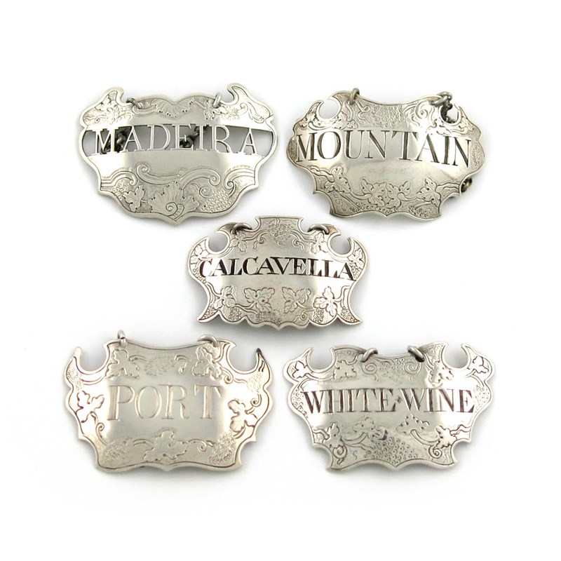 cartouche form, chased vine decoration, incised and blackened 'CALCAVELLA' and incised 'PORT', 'WHITE.WINE', 'MOUNTAIN' and one pierced 'MADEIRA', approx. weight 2oz. (5)