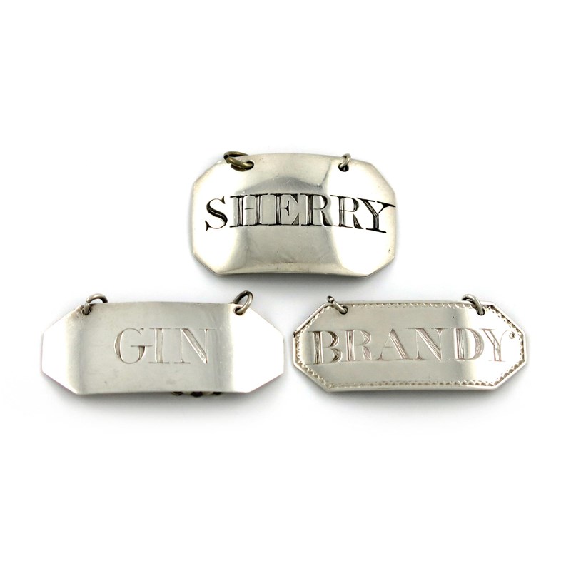 comprising: one by Hampston, Prince and Cattles, York circa 1803, rectangular form, canted corners, incised 'SHERRY', plus one by Richard Clark, York circa 1792, incised 'BRANDY' and another by the same maker, incised 'GIN', approx. weight 0.9oz. (3)