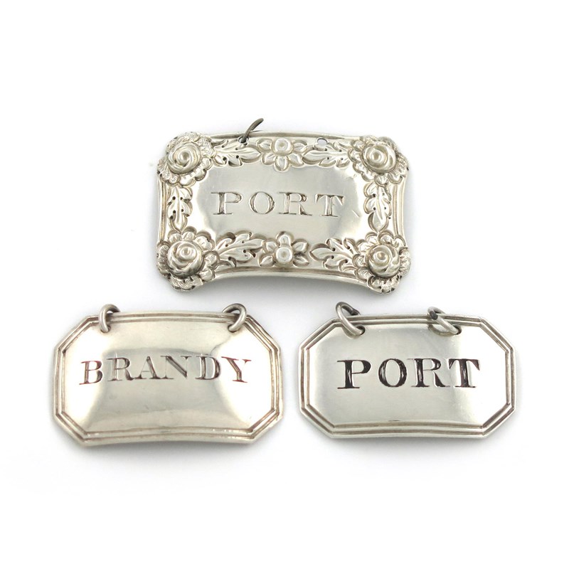 comprising: one by Barber, Cattle and North, York circa 1825, rectangular form, canted corners, incised and blackened 'PORT', plus one by John Bell, York circa 1845, incised 'BRANDY' and one by Barber and Whitwell, York circa 1820, incised 'PORT', approx. weight 0.8oz. (3)