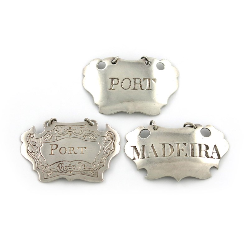 comprising a mid-18th century one by John Langlands I, Newcastle circa 1760, cartouche form, incised 'PORT', plus one by Thomas Watson, Newcastle, 1797, incised 'MADEIRA', and an unmarked label, incised 'PORT', approx. weight 1.2oz. (3)