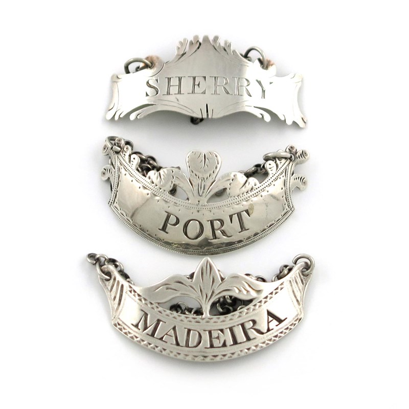 comprising: one by Richard Richardson, Chester circa 1790, scroll form, pierced pediment, incised 'MADEIRA', plus one by Thomas Ollivant of Manchester, with London marks for 1791, with Prince of Wales feathers, incised 'PORT', and one by Joseph Hewitt, Chester circa 1795, incised 'SHERRY', approx. weight 0.7oz. (3)
