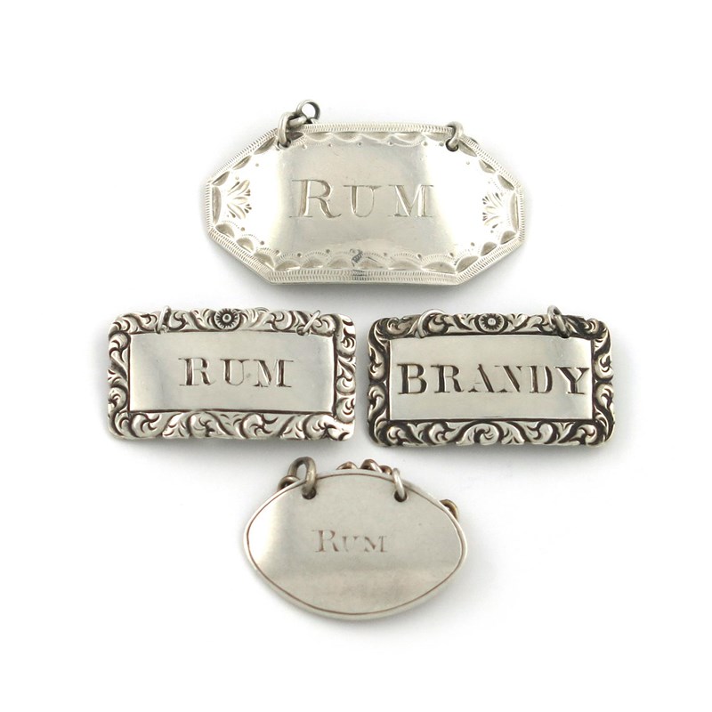 comprising: one by Langlands and Robertson, Newcastle circa 1795, rectangular form, canted corners, incised 'RUM', plus a pair by Thomas Wheatley, Newcastle circa 1835, incised 'RUM' and 'BRANDY', and one by John Walton, Newcastle circa 1835, oval form, incised 'RUM', approx. weight 0.9oz. (4)