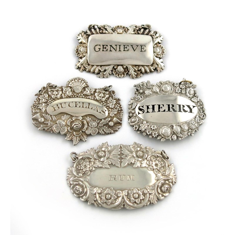 foliate, shell and gadroon borders, incised 'GENIEVE', 'BUCELLAS', 'SHERRY' and 'RUM', approx. weight 2.2oz.