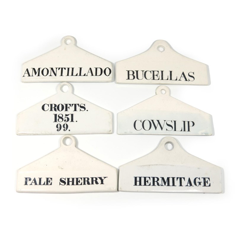 arched rectangular form, titled in black 'COWSLIP', 'PALE SHERRY', 'HERMITAGE', 'CROFTS 1851. 99', 'AMONTILLADO', and 'BUCELLAS'. (6)