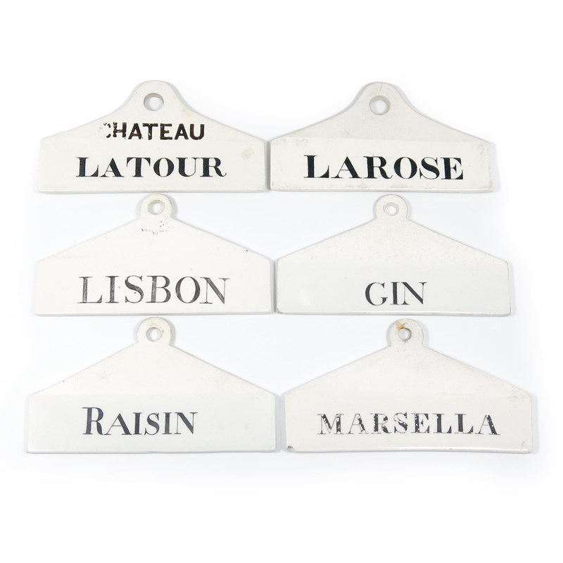 arched rectangular form, titled in black 'RAISIN', 'CHATEAU LATOUR', 'MARSELLA', 'LISBON', 'GIN', and 'LAROSE'. (6)