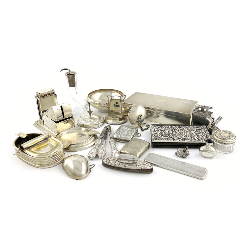comprising: a dish, a combination table cigar cutter, ashtray and matchbox holder, a ring tree, a cigarette box, a silver-mounted purse, a vesta case, a lighter, a manicure set, a drip pan, a miniature rabbit, a Dutch windmill, a stopper, plus electroplated items: a trump marker, a sardine tin ashtray and other items, approx. weighable 7oz. (qty)