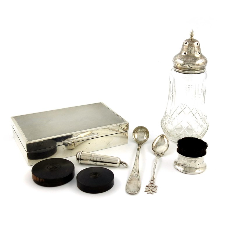 comprising: a pen wipe, by Saunders and Shepherd, Chester 1904, a cigarette box, a silver-mounted glass sugar caster, a cigarette holder, a spoon, an American ladle and two wooden boxes, approx. weighable 1.6oz. (8)