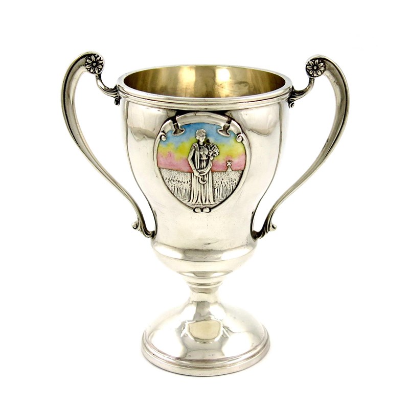 tapering circular form, scroll handles, the front applied with an enamel plaque of a lady standing in a field with a sickle and corn, and with a windmill in the background, height 17cm, approx. weight 10oz.