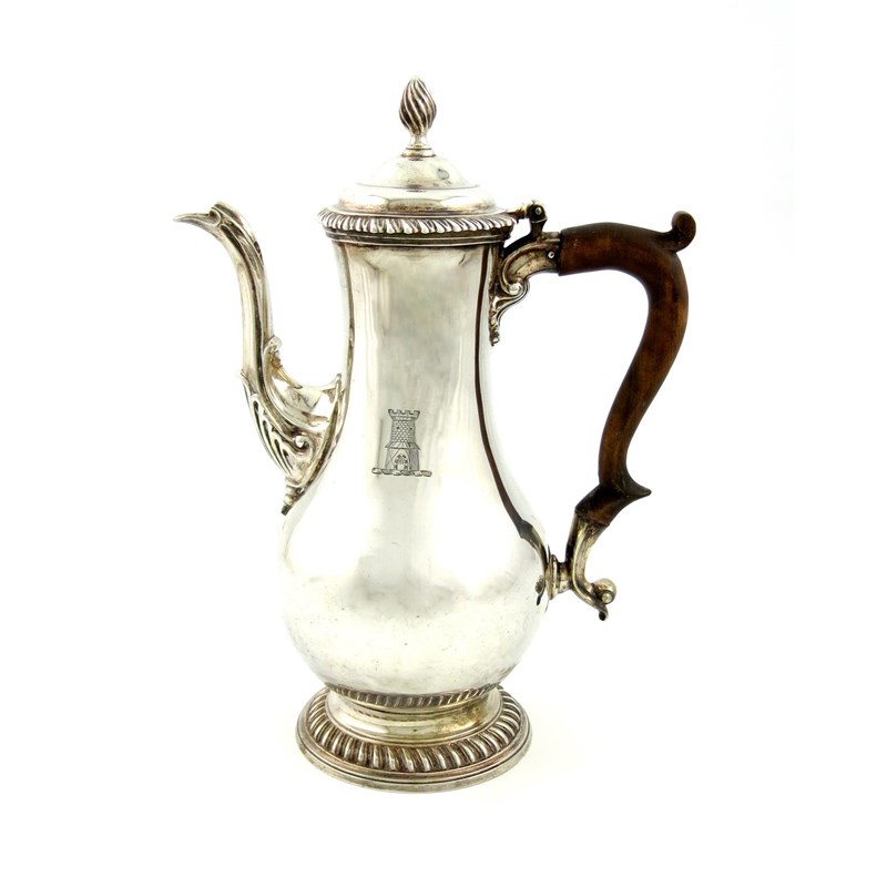 baluster form, scroll handle, shell capped spout, domed hinged cover with a fluted finial, on a raised circular foot with a gadroon border, height 27.5cm, approx. weight 25.5oz.