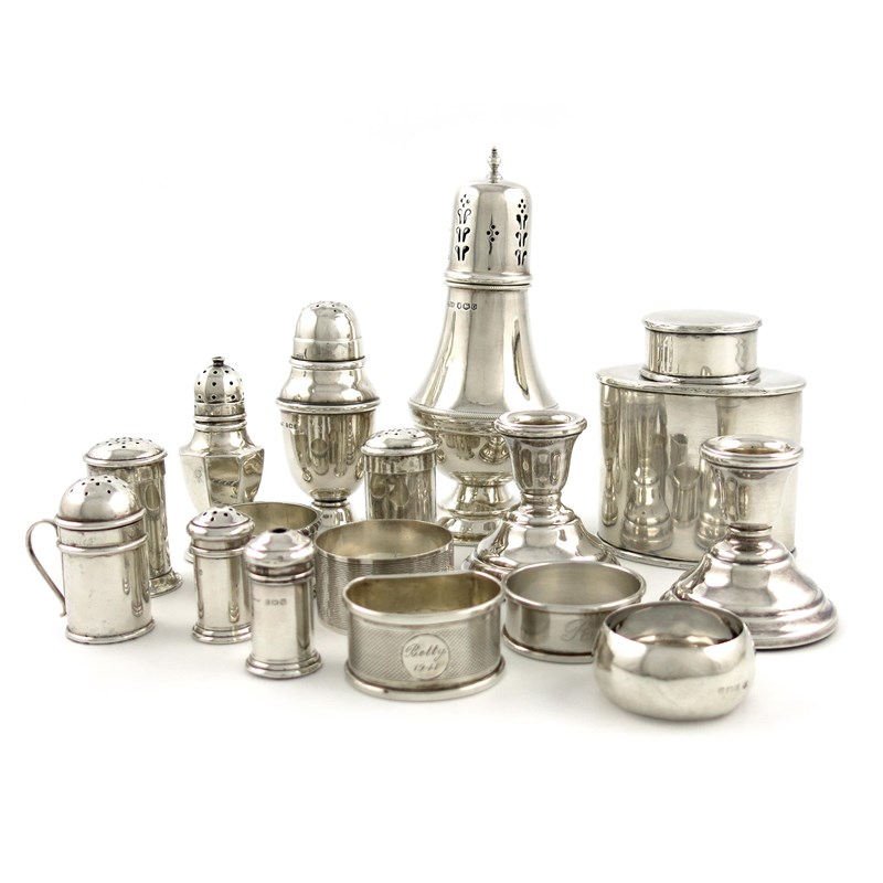 comprising: an Edwardian tea caddy, Birmingham 1905, oval form, pull-off cover, plus a sugar caster, a pair of dwarf candlesticks, a kitchen pepper pot, a pair of pepper pots, a salt and pepper pot, two further pepper pots and five napkin rings, approx. weighable 14.8oz. (qty)