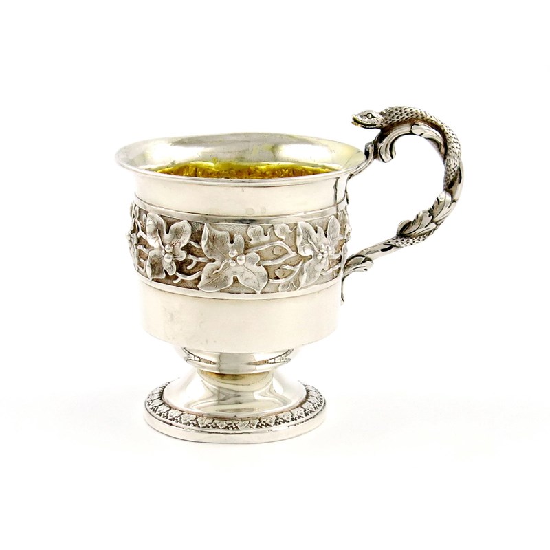 circular form, chased foliate girdle, on a matted background, the scroll handle mounted with a reptile, on a raised circular foot with a foliate border, gilded interior, height 9.7cm, approx. weight 5.3oz.