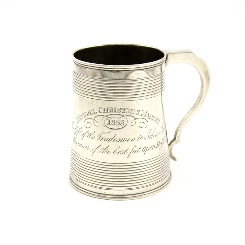 tapering circular form, scroll handle, with an upper and lower band of reeded decoration, engraved with the crest of a bird and inscribed 'Arundel Christmas Market, 1833, The Gift of the Tradesmen to John Jupp, the Owner of the Best Fat Open Heifer', height 11cm, approx. weight 8.3oz.