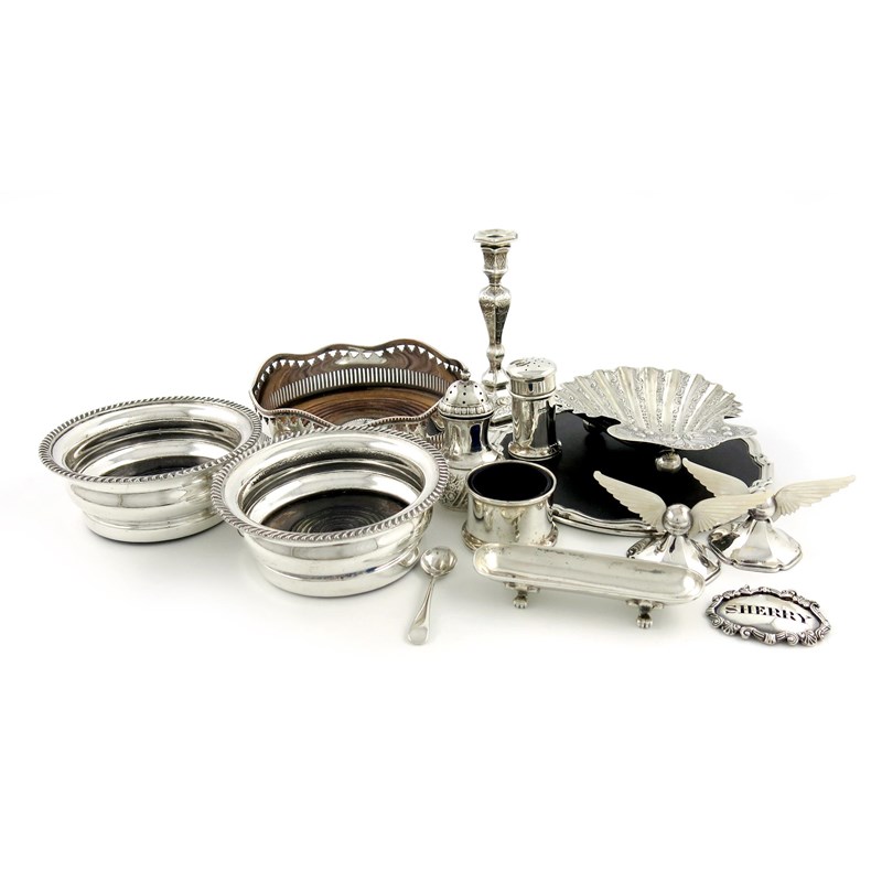 comprising silver items: a Victorian taper stick, by the Barnards, London 1844, on a hexagonal base, engraved decoration, plus a silver-mounted tea pot stand, a pair of silver and mother-of-peal knife rests, a butter shell, an Austrian cigar ashtray, two pepper pots, a salt cellar and spoon, a George III wine label, London 1818, pierced 'SHERRY', and three electroplated wine coasters, approx. weighable 9oz. (qty)