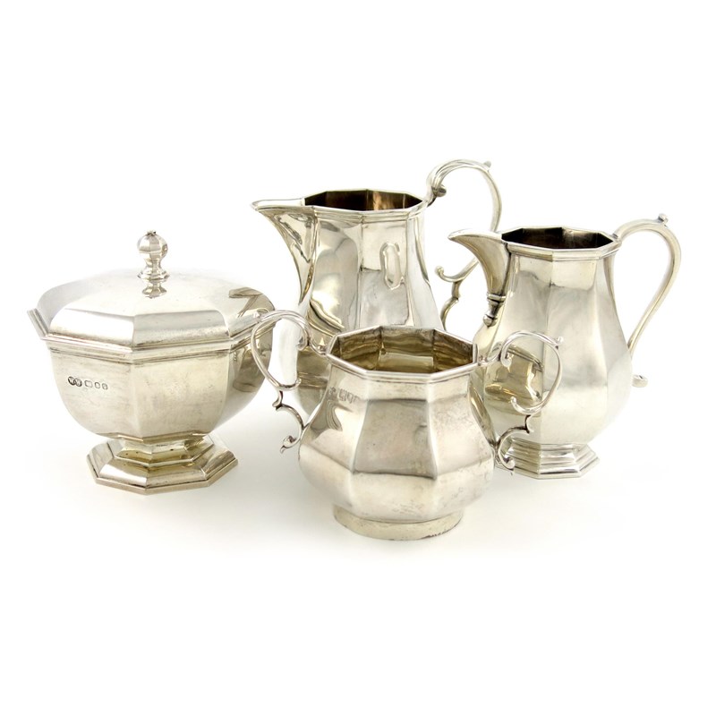 tapering octagonal form, plus a similar cream jug by the same maker, London 1979, and another cream jug, London 1923 and a sugar bowl 1899, approx. weight 32oz. (4)
