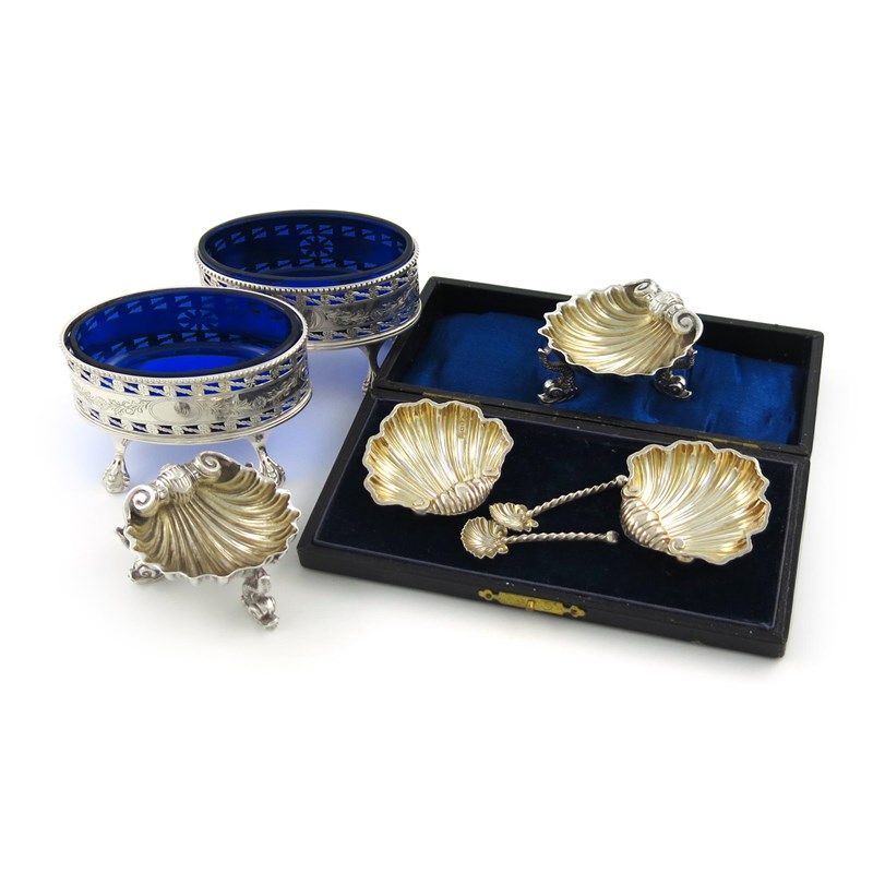 comprising: an Edwardian Irish pair, by J.S, Dublin 1907, oval form, on four claw and ball feet, pierced and engraved decoration, with blue glass liners, plus a pair of Victorian shell salts, and a cased pair of shell form, with two spoons, in a fitted case, approx. weight 7oz. (6)