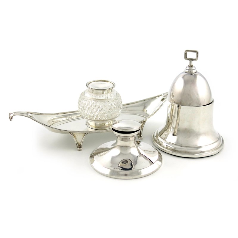 by Robert Pringle and Sons, Chester 1928, oval form, on four bracket feet, with a silver-mounted cut glass inkwell, mount loose, length 28.3cm, plus a silver inkwell of bell form, by A and J Zimmerman, Birmingham 1914, and a capstan inkwell, approx. weighable 7.3oz. (3)