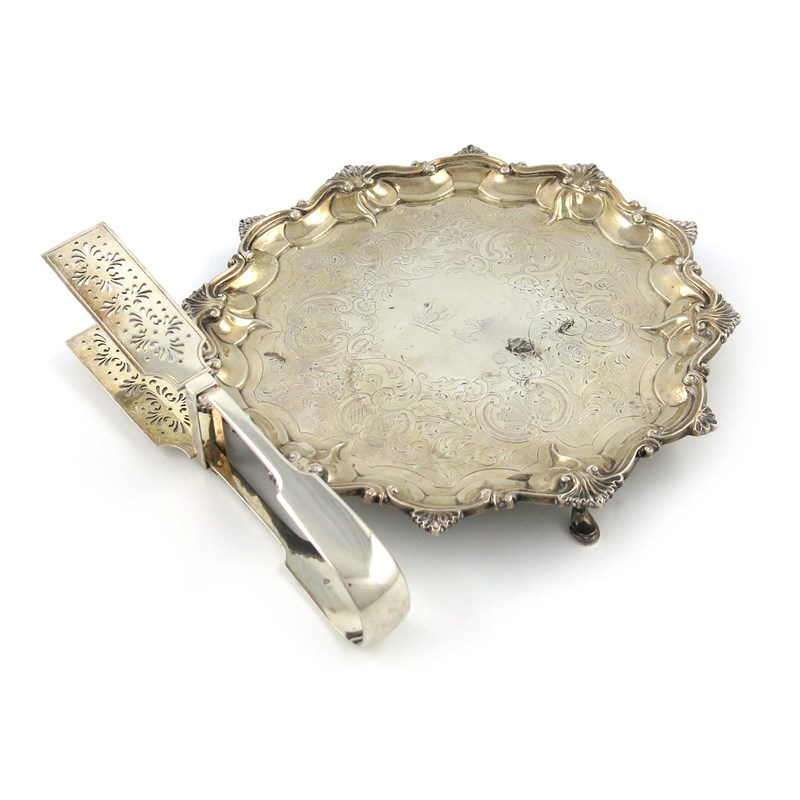 pierced blades, length 22.5cm, plus a George III salver with later decoration, shell and scroll border, on three hoof feet, diameter 25.3cm, approx. total weight 20oz. (2)