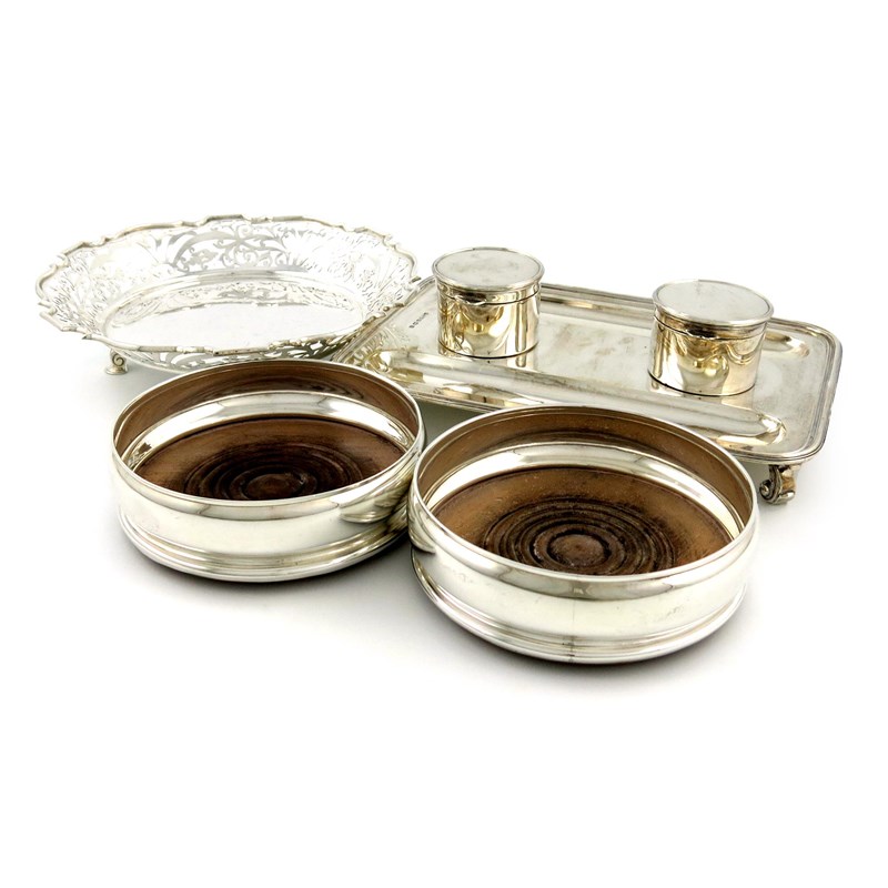 comprising: an inkwell, by Asprey and Co, Birmingham 1932, rectangular form, moulded border, with two inkwells and two pen wells, lacking glass liners, plus a pierced circular dish and a pair of modern wine coasters, London 1971, approx. weight 27oz. (4)