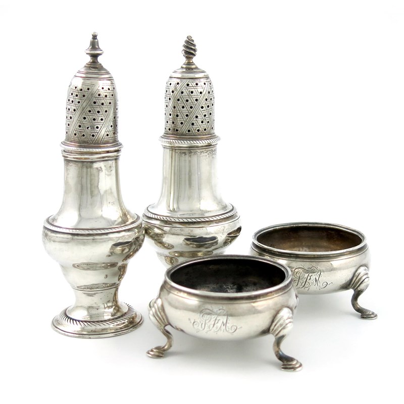 circular bellied form, rope-work borders, one with an urn finial, the other with a fluted finial, plus a pair of George II salt cellars, London 1747, approx. weight 9.7oz. (4)
