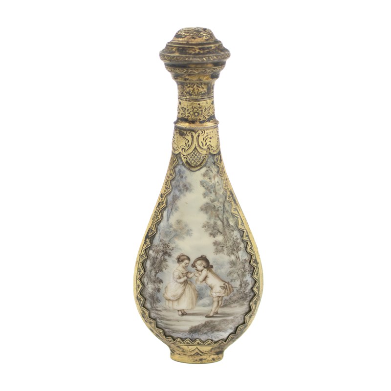 slender baluster form, decorated with children in woodland glades, the mounts with engraved decoration, hinged cover, height 10.2cm.