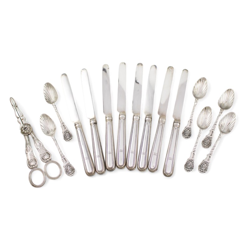 comprising: a set of seventeen Thread dessert knives, by Moses Brent, London 1806, engraved with the Little crest, a pair of King's Honey Suckle pattern grape scissors, London 1825, and a set of six 18th century teaspoons with mask terminals, approx. weighable 6.2oz. (qty)