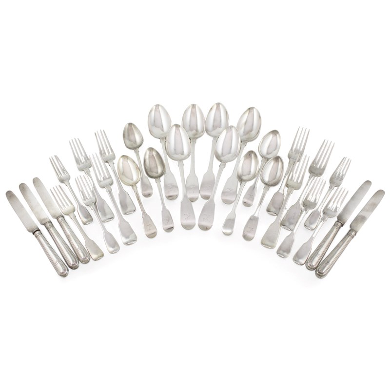 comprising: twelve tablespoons, nine table forks, eleven dessert forks, six dessert spoons, and five Thread dessert knives, approx. weighable 75oz. (qty)