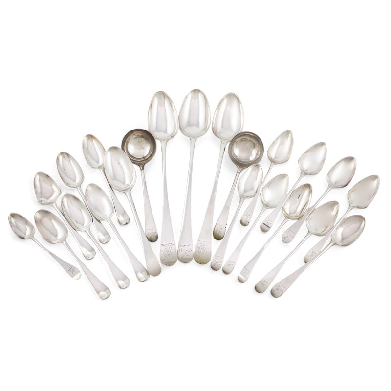 comprising: a pair of basting spoons, London 1777, a single basting spoon, two sauce ladles, a tablespoon, nine dessert spoons and a teaspoon, plus six Hanoverian pattern dessert spoons, London 1742, approx. weight 30oz. (qty)