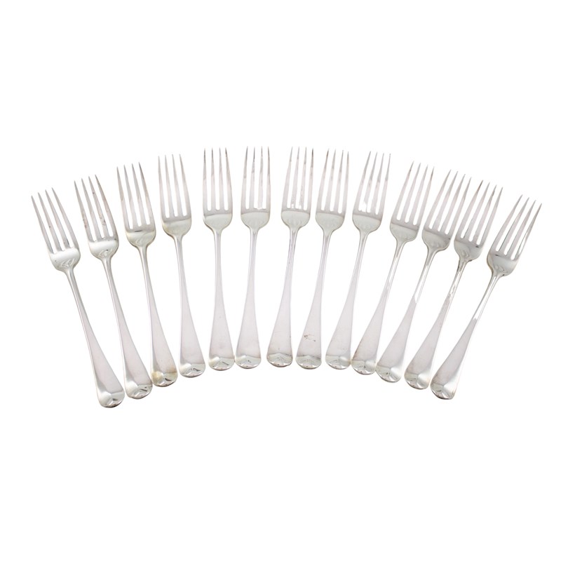 A set of thirteen George III silver Old English pattern table forks,