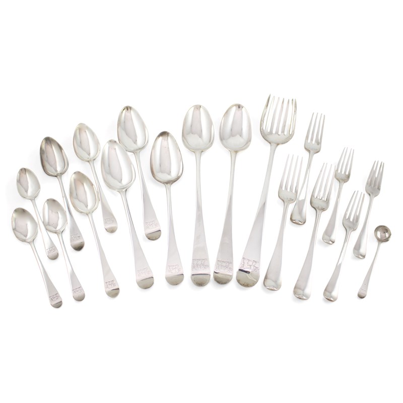 the terminals engraved with a crest, comprising: twenty-three table forks, twenty-two dessert forks, seven tablespoons, six dessert spoons, nine teaspoons, a salt spoon, a salad fork and a pair of basting spoons, approx. weight 116oz. (qty)