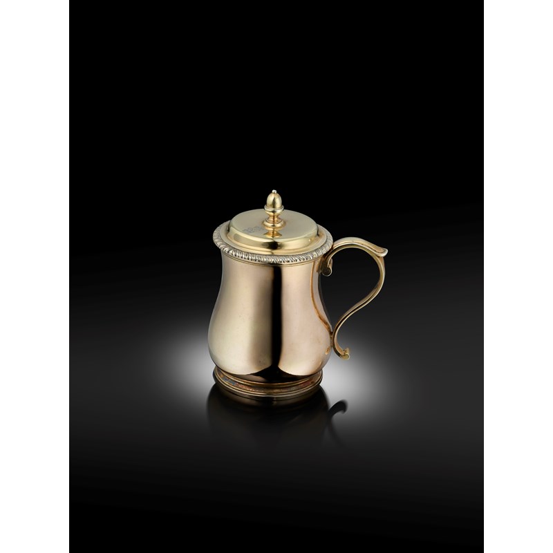 baluster form, scroll handle, pull-off cover with a gadroon border and acorn finial, engraved with the Royal crest and inscribed to the rim of the cover and the underside of the base 'The Gift of Her Majesty Mrs. Louisa Cheveley, His Royal Highness Prince Alfred Born Sept. 22nd1780, died Aug.20th 1782', height 11.5cm, approx. weight 8.7oz.