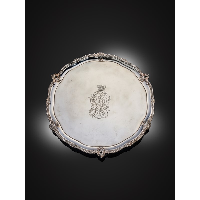 circular form, pierced scroll and gadroon border, on three pierced scroll bracket feet, the centre engraved with the crowd cypher of Queen Charlotte above the initials LC, diameter 42cm, approx. weight 52oz.