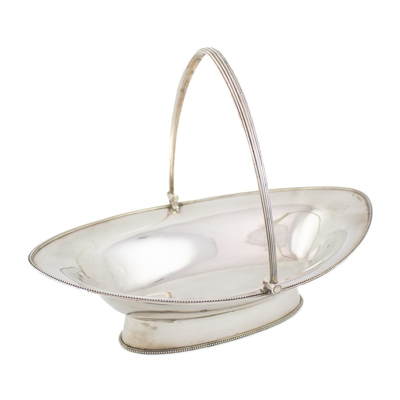 oval form, beaded borders, reeded swing-handle, on an oval foot, length 38cm, approx. weight 32.7oz.
