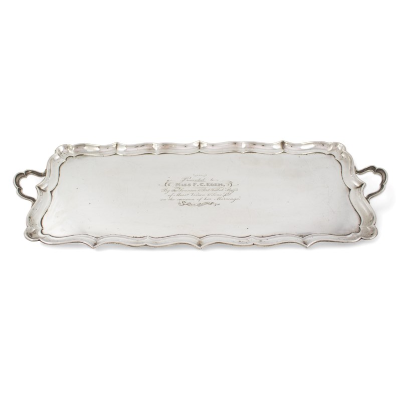 rectangular form, moulded border, with a presentation inscription, length handle to handle 55cm, approx. weight 37.5oz.